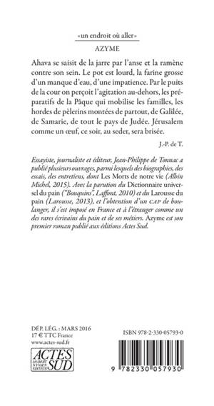 "Des mains de femme sur le pain, le «corps» du Christ«". »La nuit de son dernier repas, le Christ partage l'azyme pascal, il se fait pain de Vie. Mais qu'était ce pain par lequel les douze ont communié ? Qui l'avait panifié pour lui ? «Azyme» c'est le mariage de l'eau et de la farine, de l'histoire singulière d'Ahava, qui a pétri le pain du seder, et de l'histoire pluriséculaire judéo-chrétienne. Un récit, doux et grave, qui touche par son évidence et sa délicatesse.