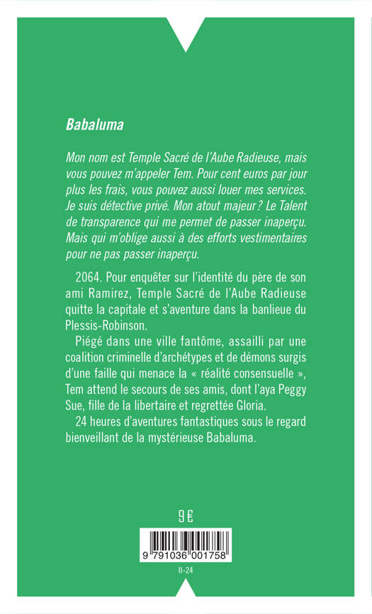 Mon nom est Temple Sacré de l'Aube Radieuse, mais vous pouvez m'appeler Tem. Pour cent euros par jour plus les frais, vous pouvez aussi louer mes services. Je suis détective privé. Mon atout majeur ? Le Talent de transparence qui me permet de passer inaperçu. Mais qui m'oblige aussi à des efforts vestimentaires pour ne pas passer inaperçu.