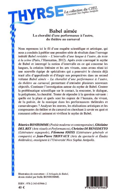 Le présent ouvrage continue l'investigation autour du mythe de Babel initié par la parution en 2012 de Babel revisitée - L'intervalle d'une langue à l'autre, du texte à la scène. Il centre la problématique scientifique sur le contact, la rencontre, le dialogue, la polyphonie, la choralité et tente de répondre à la question suivante : quelle est la place et quels sont les enjeux de l'humain, du vivant, de la poésie, de la musique dans les performances théâtrales et carnavalesques ?