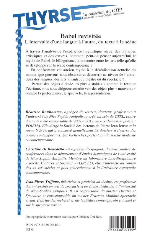 A travers l'analyse de l'expérience linguistique vécue, des pratiques artistiques et des oeuvres, comment peut-on penser aujourd'hui le mythe de Babel, le bilinguisme, la rencontre entre les arts telle qu'elle se développe sur la scène contemporaine ? En confrontant cet ancien mythe à la déréalisation actuelle du monde, que pouvons-nous observer et découvrir au niveau de l'entre-deux langues, des arts vivants, du théâtre ou du spectacle ?