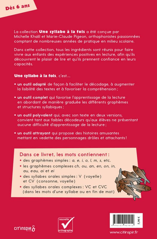 Série rouge Jaco pêche sur son bateau, quand Babou la baleine sort de l’eau. Dans ce livre, les mots contiennent : des graphèmes simples : a, e, i, o, l, m, s, etc. les graphèmes complexes ch, ou, an, en, on, in, au, eau, ai et ei des syllabes orales simples : V (voyelle) et CV (consonne, voyelle) des syllabes orales complexes : VC et CVC (dans les mots d’une syllabe ou en fin de mot)