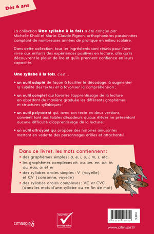 Des textes adaptés pour lire plus facilement ! Pour faciliter l’apprentissage de la lecture, les mots qui composent les histoires ont été sélectionnés en fonction de leur familiarité, de leur structure syllabique et des graphèmes qu’ils contiennent. Plusieurs adaptations visuelles permettent de réduire la charge cognitive liée au décodage et de limiter l’encombrement perceptif. Les livrets contiennent deux fois la même histoire : dans la première version, syllabes orales, lettres muettes et graphèmes complexes sont mis en relief ; dans la seconde, ces adaptations ne sont pas présentes. Ce sont donc des outils polyvalents qui favorisent le transfert des acquis et qui conviennent à tous les enfants. Les histoires fantaisistes mettent en scène des personnages rigolos et attachants. La trame narrative captive les jeunes lecteurs tout en leur permettant de faire des prédictions. Les illustrations leur donnent aussi de nombreuses occasions de faire des inférences.