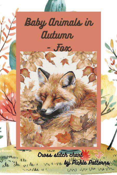 This cross stitch design is of a vintage style baby fox in an autumnal woodland den.