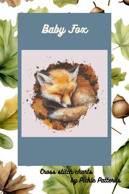 This cross stitch design is of a vintage style baby fox in an autumnal woodland den.