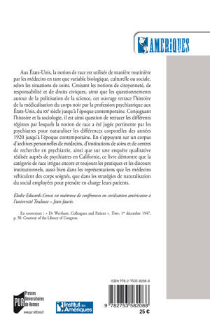Aux États-Unis, la notion de race est utilisée de manière routinière par les médecins en tant que variable biologique, culturelle ou sociale, selon les situations de soins. En s'appuyant sur un corpus d'archives personnelles de médecins, d'institutions de soins et de centres de recherche en psychiatrie, ainsi que sur une enquête qualitative réalisée auprès de psychiatres en Californie, ce livre démontre que la catégorie de race irrigue encore et toujours les pratiques et les discours institutionnels.