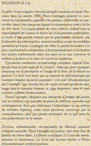 «Ecrivain, ethnobotaniste, correspondant du Muséum national d'histoire naturelle, Pierre Lieutaghi est l'auteur, chez Actes Sud, de »Jardins du chêne blanc, La Plante compagne, Le Livre des arbres, arbustes et arbrisseaux, Le Livre des bonnes herbes et Petite ethnobotanique méditerranéenne.