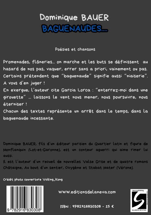 Recueil de poèmes. Promenades, flâneries... on marche et les buts se définisssent au hasard de nos pas, vacquer, errer sans a priori, vainement ou pas. Certains prétendent que "baguenaude" signifie aussi "niaiserie". A vous d'en juger. En exergue, l'auteur cite Garcia Lorca : " Enterrez-moi dans une girouette" ... Laissons le vent nous mener, nous poursuivre, nous éterniser ! Chacun de ces textes représente un arrêt dans le temps, dans la baguenaude incessante.