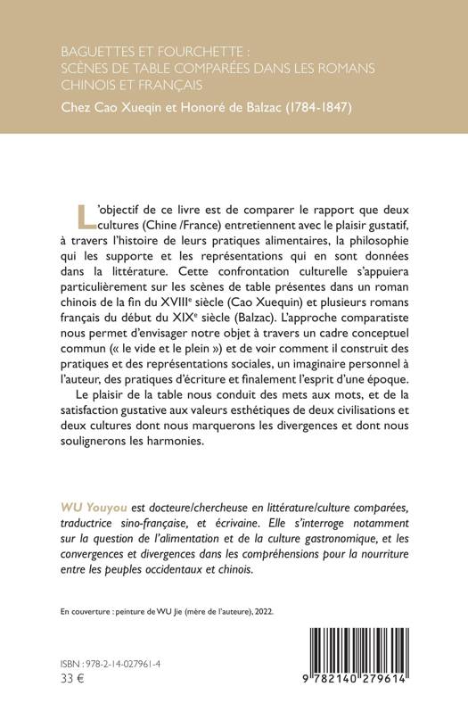 L'objectif de ce livre est de comparer le rapport que deux cultures (Chine /France) entretiennent avec le plaisir gustatif, à travers l'histoire de leurs pratiques alimentaires, la philosophie qui les supporte et les représentations qui en sont données dans la littérature. Cette confrontation culturelle s'appuiera particulièrement sur les scènes de table présentes dans un roman chinois de la fin du XVIIIe siècle (Cao Xuequin) et plusieurs romans français du début du XIXe siècle (Balzac). L'approche comparatiste nous permet d'envisager notre objet à travers un cadre conceptuel commun (« le vide et le plein ») et de voir comment il construit des pratiques et des représentations sociales, un imaginaire personnel à l'auteur, des pratiques d'écriture et finalement l'esprit d'une époque. Le plaisir de la table nous conduit des mets aux mots, et de la satisfaction gustative aux valeurs esthétiques de deux civilisations et deux cultures dont nous marquerons les divergences et dont nous soulignerons les harmonies.
