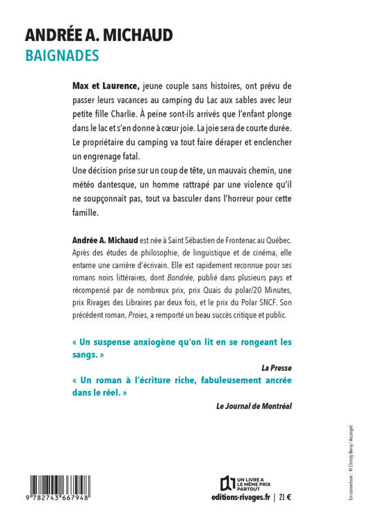 Max, Laurence sa femme et leur fille Charlie viennent d'arriver au camping de Lac aux Oies pour passer de merveilleuses vacances. Mais à peine Charlie est-elle dans l'eau que le responsable du camp lui intime do sortir et de s'habiller décemment. Un autre incident, encore plus traumatisant, va se produire, conduisant Max à quitter les lieux. En pleine nuit, sous l'orage, à bord d'un camping car dont il ne maîtrise pas bien la conduite. Il va prendre la mauvaise direction. Pour le pire... Un thriller implacable dans lequel Andrée Michaud explore la destruction d'une famille.