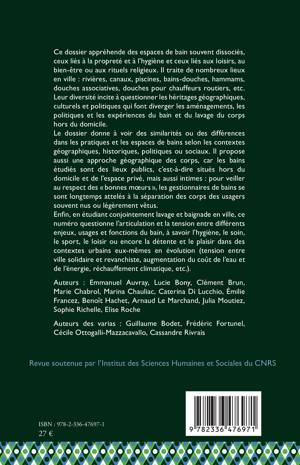 Ce dossier appréhende des espaces de bain souvent dissociés, ceux liés à la propreté et à l'hygiène et ceux liés aux loisirs, au bien-être ou aux rituels religieux. Il traite de nombreux lieux en ville: rivières, canaux, piscines, bains-douches, hammams, douches associatives, douches pour chauffeurs routiers, etc. Leur diversité incite à questionner les héritages géographiques, culturels et politiques qui font diverger les aménagements, les politiques et les expériences du bain et du lavage du corps hors du domicile. Le dossier donne à voir des similarités ou des différences dans les pratiques et les espaces de bains selon les contextes géographiques, historiques, politiques ou sociaux. Il propose aussi une approche géographique des corps, car les bains étudiés sont des lieux publics, c'est-à-dire situés hors du domicile et de l'espace privé, mais aussi intimes: pour veiller au respect des bonnes moeurs, les gestionnaires de bains se sont longtemps attelés à la séparation des corps des usagers souvent nus ou légèrement vêtus. Enfin, en étudiant conjointement lavage et baignade en ville, ce numéro questionne l'articulation et la tension entre différents enjeux, usages et fonctions du bain, à savoir l'hygiène, le soin, le sport, le loisir ou encore la détente et le plaisir dans des contextes urbains eux-mêmes en évolution (tension entre ville solidaire et revanchiste, augmentation du coût de l'eau et de l'énergie, réchauffement climatique, etc.).