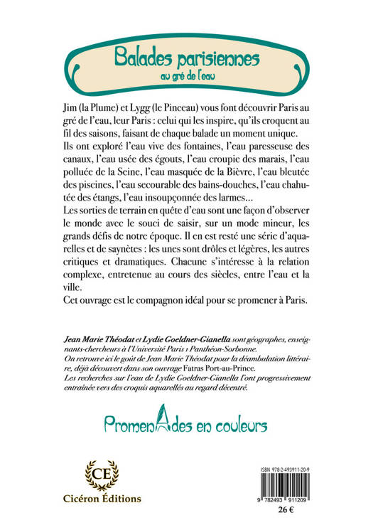 Jim (la Plume) et Lygg (le Pinceau) vous font découvrir Paris au gré de l’eau, leur Paris : celui qui les inspire, qu’ils croquent au fil des saisons, faisant de chaque balade un moment unique.Ils ont exploré l’eau vive des fontaines, l’eau paresseuse des canaux, l’eau usée des égouts, l’eau croupie des marais, l’eau polluée de la Seine, l’eau masquée de la Bièvre, l’eau bleutée des piscines, l’eau secourable des bains-douches, l’eau chahutée des étangs, l’eau insoupçonnée des larmes…Les sorties de terrain en quête d’eau sont une façon d’observer le monde avec le souci de saisir, sur un mode mineur, les grands défis de notre époque. Il en est resté une série d’aquarelles et de saynètes : les unes sont drôles et légères, les autres critiques et dramatiques. Chacune s’intéresse à la relation complexe, entretenue au cours des siècles, entre l’eau et la ville.Cet ouvrage est le compagnon idéal pour se promener à Paris.