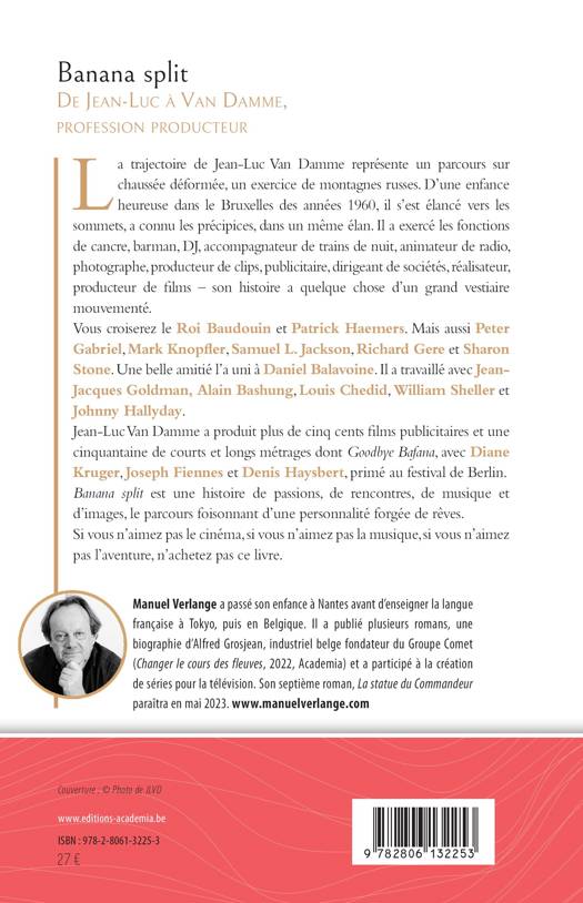 Banana Split ou un parcours sur chaussée déformée, un exercice de montagnes russes. Jean-Luc Van Damme a gravi les sommets et dévalé les précipices. De cancre, il est devenu producteur de films. Dans son vestiaire mouvementé, vous croiserez le Roi Baudouin, VDB et Patrick Haemers. Mais aussi Peter Gabriel, Samuel L. Jackson, Richard Gere et Sharon Stone. Une belle amitié l'a uni à Daniel Balavoine. Il a travaillé avec Jean-Jacques Goldman, Alain Bashung, William Sheller et Johnny Hallyday. Mark Knopfler est venu prendre une douche à la maison. Il a produit un grand film international primé à Berlin, Goodbye Bafana, avec Diane Kruger, Joseph Fiennes et Denis Haysbert. Jean-Luc Van Damme a produit plus de cinq cents films publicitaires et une cinquantaine de courts et longs métrages. Une soif de passion, de rencontres, de musique et d'images, avec un taux de bonheur et de tragédie au-dessus des moyennes habituelles.