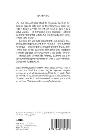 Du jour où Monsieur Paul, le nouveau pasteur, débarque dans le petit port de Thornshaw, au coeur des Féroé, toute la ville retient son souffle. Parce qu'à celui-là aussi - on l'imagine, on le pressent - la belle Barbara va tourner la tête. Or elle ne sait aimer longtemps sans trahir... Barbara est un livre envoûtant, audacieux, magnifiquement provocant. Son héroïne - une Carmen nordique - offense par sa beauté même, mais, dans l'impudeur de ses passions, elle garde une ingénuité d'enfant espiègle amoureuse de la vie et de l'amour. Inoubliable portrait de femme, Barbara est à redécouvrir d'urgence comme un chef-d'oeuvre mélancolique et fl amboyant.