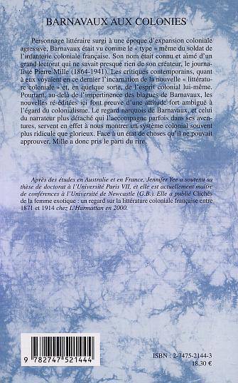 Personnage littéraire surgi à une époque d'expansion coloniale agressive, Barnavaux était vu comme le type même du soldat de l'infanterie coloniale française. Les critiques contemporains voyaient en son créateur, le journaliste Pierre Mille (1864-1941), l'incarnation de l'esprit colonial lui-même. Pourtant, au delà de l'impertinence des blagues de Barnavaux, les nouvelles ici rééditées font preuve d'une attitude fort ambiguë à l'égard du colonialisme : le regard narquois de Barnavaux nous révèle en effet un système colonial souvent plus ridicule que glorieux. Face à l'inacceptable, Mille a pris le parti de rire.
