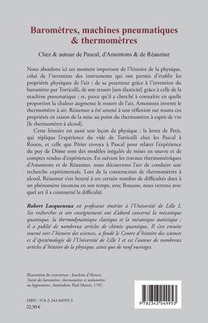 Cet ouvrage présente à la fois une histoire et une anthologie des travaux de quelques physiciens qui ont conçu et fabriqué des baromètres, des machines à vide et des thermomètres, instruments qui, en leur temps (XVIe et XVIIIe siècles) sont des inventions nouvelles. Les travaux de trois auteurs sont privilégiés : Pascal, Amontons et Réaumur avec une remise en contexte de leurs ouvrages, des évènements qui les motivent, des travaux qui les inspirent, des questions qu'ils se posent et des phénomènes qu'ils veulent interpréter.