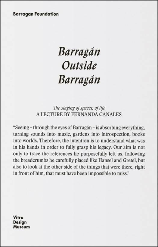 This publication is based on an illustrated talk presented by architect and historian Fernanda Canales in June 2024 at the Vitra Design Museum as part of the Barragán Lecture series. It focuses on the Mexican architect Luis Barragán (1902-88), whose work occupies a permanent place in the canon of 20th-century architecture and continues to fascinate architectural scholars, connoisseurs and enthusiasts.