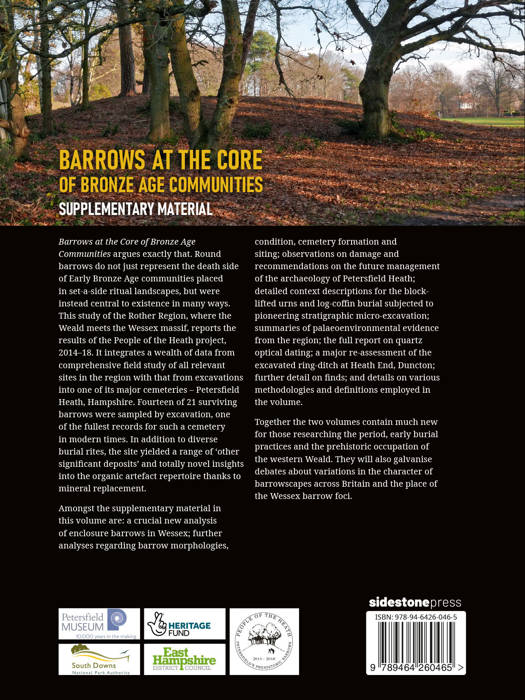 Amongst the supplementary material in this volume are: a crucial new analysis of enclosure barrows in Wessex; further analyses regarding barrow morphologies, condition, cemetery formation, and siting; observations on damage and recommendations on the future management of the archaeology of Petersfield Heath; detailed context descriptions for the block-lifted urns and log-coffin burial subjected to pioneering stratigraphic micro-excavation; summaries of palaeoenvironmental evidence from the region; the full report on quartz optical dating; a major re-assessment of the excavated ring-ditch at Heath End, Duncton; further detail on finds; and details on various methodologies and definitions employed in the volume.