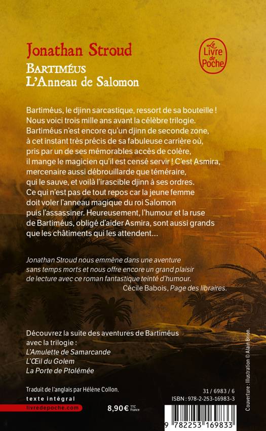 Bartiméus, le djinn sarcastique ressort de sa bouteille ! Nous voici 3 000 ans avant la célèbre trilogie. Bartiméus n’est encore qu’un djinn de seconde zone, à cet instant très précis de sa fabuleuse carrière où, pris par un de ses mémorables accès de colère, il mange le magicien qu’il est censé servir ! C’est Asmira, mercenaire aussi débrouillarde que téméraire qui le sauve, et voilà l’irascible djinn à ses ordres. Ce qui n’est pas de tout repos car la jeune femme doit voler l’anneau magique du roi Salomon puis l’assassiner. Heureusement, l’humour et la ruse de Bartiméus, obligé d’aider Asmira, sont aussi grands que les châtiments qui l’attendent…