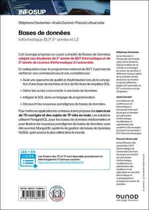 un cours complet de Bases de données adapté aux étudiants de 2e année de BUT Informatique et de 2e année de Licence d’informatique à l’université.Pensé comme une suite au premier ouvrage, il vise à renforcer les connaissances et compétences de l'étudiant en bases de données en abordant les quatre principaux points du programme national du BUT :