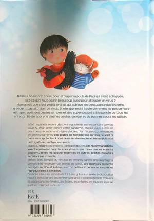 Basile a beaucoup couru pour attraper la poule de Papi qui s’est échappée. Est-ce qu’il faut courir beaucoup aussi pour attraper un virus ? Maman dit que c’est plutôt le virus qui attrape les gens, parce que les gens ne veulent pas attraper de virus. Et elle apprend à Basile comment ne pas se faire attraper, avec des gestes simples et des super-pouvoirs à la portée de tous les enfants. Basile apprend ainsi les gestes sanitaires de base et saura les utiliser. 2020 : la planète entière découvre la gravité de la crise sanitaire du virus Covid-19. Pour lutter contre cette pandémie, chaque pays a mis en place des précautions et règles strictes. Parmi celles-ci, on retrouve les gestes barrières. Ces gestes qui font barrage au virus ne sont ni naturels ni agréables. A nous de les rendre simples et banals pour nos petits, afin de protéger leur avenir. Etablis au départ pour limiter la contagion du Covid, ces recommandations valent également pour tous les virus ou microbes que les enfants côtoient, telles les gastro-entérites et autres petites maladies scolaires par exemple. Tenant donc compte du fait que les enfants auront ainsi avantage à connaître et respecter ces gestes de santé, cet album les présente de façon sereine et ludique, avec de petites expériences simples et reproductibles à la maison. Destinée à tous les enfants de 2 à 7 ans grâce à un texte évolutif, cette histoire écrite par une ancienne enseignante d’école maternelle trouvera sa place dans les familles, les écoles, les crèches, et tous les lieux où sont accueillis des enfants.