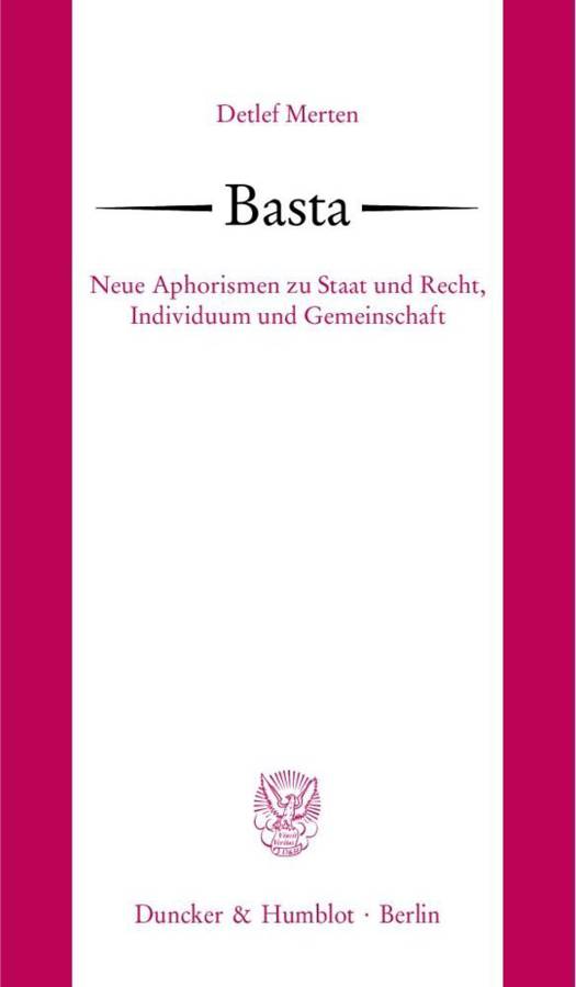 Rechtzeitig zum 70. Geburtstag wurden 2007 im Verlag Duncker & Humblot unter dem Titel »Basta« - 10 Jahre nach Erscheinen von »Kurzum Punktum« - die »Neuen Aphorismen zu Staat und Recht, Individuum und Gemeinschaft« des Staatsrechtslehrers Detlef Merten veröffentlicht.