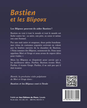 Les Blipoux peuvent-ils aider Bastien ? Bastien en veut à tout le monde et tout le monde est fâché contre lui : sa mère, son père, sa sœur et même son ami Samuel. Par une nuit noire et orageuse, deux petits bonshommes vêtus de costumes argentés arrivent en volant par la fenêtre ouverte de la chambre de Bastien. «Nous sommes des Blipoux, annoncent-ils. Nous nous appelons Mori et Groge et nous avons de supers idées pour t’aider. » Mais les Blipoux se disputent pour savoir qui a les meilleures idées. Parfois, Bastien écoute Mori. Parfois, il écoute Groge. Parfois, il ne sait pas qui il doit écouter.