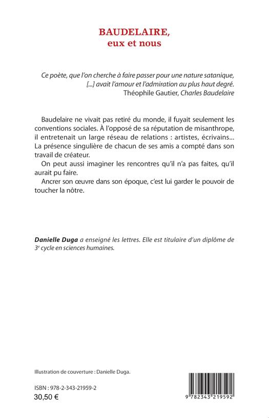 Ce poète, que l'on cherche à faire passer pour une nature satanique, [...] avait l'amour et l'admiration au plus haut degré. Théophile Gautier, Charles Baudelaire Baudelaire ne vivait pas retiré du monde, il fuyait seulement les conventions sociales. À l'opposé de sa réputation de misanthrope, il entretenait un large réseau de relations: artistes, écrivains... La présence singulière de chacun de ses amis a compté dans son travail de créateur. On peut aussi imaginer les rencontres qu'il n'a pas faites, qu'il aurait pu faire. Ancrer son oeuvre dans son époque, c'est lui garder le pouvoir de toucher la nôtre.