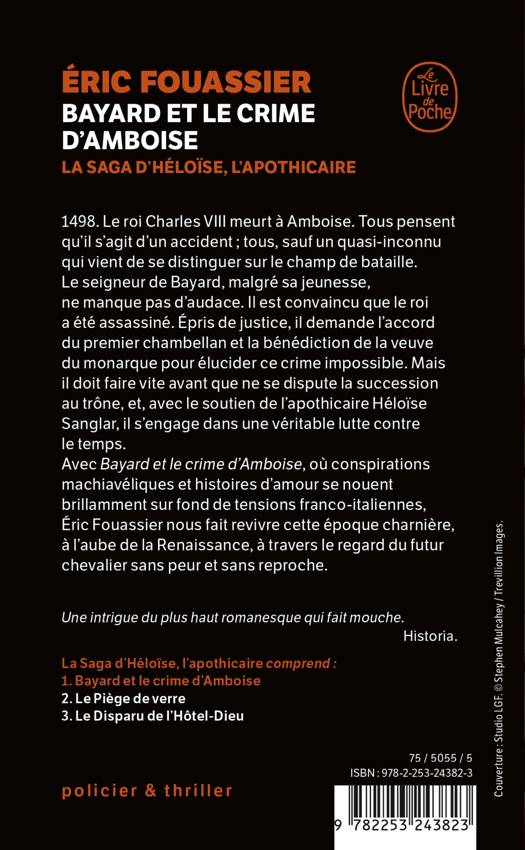 1498. Le roi Charles VIII meurt à Amboise. Tous pensent qu’il s’agit d’un accident ; tous, sauf un quasi-inconnu qui vient de se distinguer sur le champ de bataille. Le seigneur de Bayard, malgré sa jeunesse, ne manque pas d’audace. Il est convaincu que le roi a été assassiné. Épris de justice, il demande l’accord du premier chambellan et la bénédiction de la veuve du monarque pour élucider ce crime impossible. Mais il doit faire vite avant que ne se dispute la succession au trône, et, avec le soutien de l’apothicaire Héloïse Sanglar, il s’engage dans une véritable lutte contre le temps.