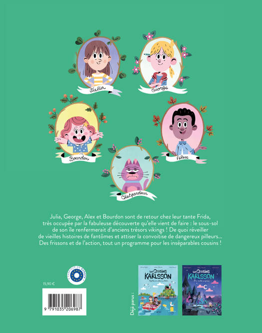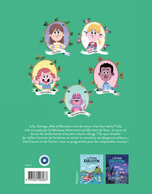 Julia, George, Alex et Bourdon sont de retour chez leur tante Frida, très occupée par la fabuleuse découverte qu'elle vient de faire : le sous-sol de son île renfermerait d'anciens trésors vikings ! De quoi réveiller de vieilles histoires de fantômes et attiser la convoitise de dangereux pilleurs... Des frissons et de l'action, tout un programme pour les inséparables cousins !