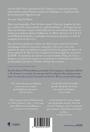 Dans cette biographie, Tom De Smet retrace le parcours remarquable de cet autoproclamé « animal politique ». Son enfance marquée par son père nationaliste, ses années universitaires joyeuses où il formait le noyau dur de la N-VA, les débuts difficiles du parti, les déceptions humaines et politiques, les triomphes et enfin l'accession au 16, rue de la Loi : tout cela est abordé dans ce livre truffé d'anecdotes surprenantes. Avec des témoignages de personnes qui lui sont ou lui étaient proches, ou qui ont négocié intensivement avec lui. Et qui ont vécu ses nombreuses transformations depuis les premières loges. De rebelle à homme d'État. De César à Auguste. De gros mangeur émotionnel à marathonien en pleine forme. Et de membre de l'opposition nationaliste flamande à Premier ministre belge.