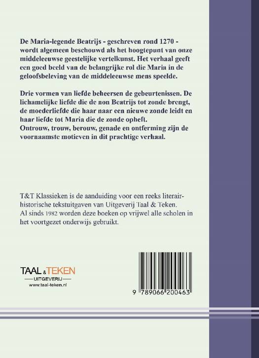 De Maria-legende Beatrijs - geschreven rond 1270 - wordt algemeen beschouwd als het hoogtepunt van onze middeleeuwse geestelijke vertelkunst. Het verhaal geeft een goed beeld van de belangrijke rol die Maria in de geloofsbeleving van de middeleeuwse mens speelde.