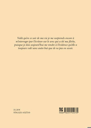 Voila qu'en ce soir de ma vie je me surprends encore a m'interroger par l'ecriture sur le sens qui a ete ma fleche, puisque je dois aujourd'hui me rendre a l'evidence qu'elle a toujours vole sans autre but que de ne pas en avoir.