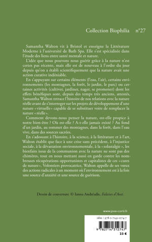 En s'appuyant sur certains éléments (l'eau, l'air), certains environnements (les montagnes, la forêt, le jardin, le parc) ou certaines activités (cultiver, jardiner, nager, se promener) dont les effets bénéfiques sont, depuis des temps très anciens, attestés, Samantha Walton retrace l'histoire de nos relations avec la nature réelle avant de s'interroger sur les projets de développement d'une nature «¿virtuelle¿» capable de se substituer voire de remplacer la nature «¿réelle¿».