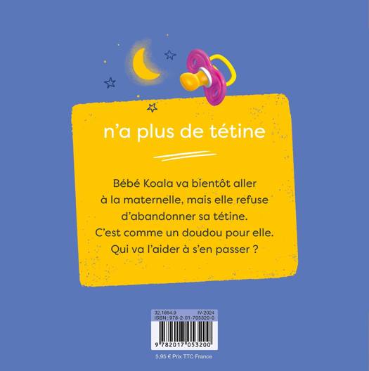 Bébé Koala va bientôt entrer à la maternelle ! Mais elle va devoir se passer de sa tétine, qui la rassure si souvent. Comment va-t-elle faire pour s’en séparer ?