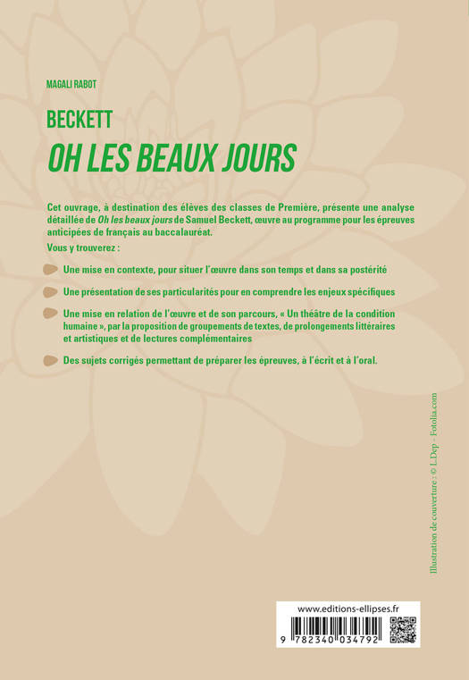 Cet ouvrage, à destination des élèves des classes de Première, présente une analyse détaillée de Oh les beaux jours de Samuel Beckett, œuvre au programme pour les épreuves anticipées de français au baccalauréat. Vous y trouverez :