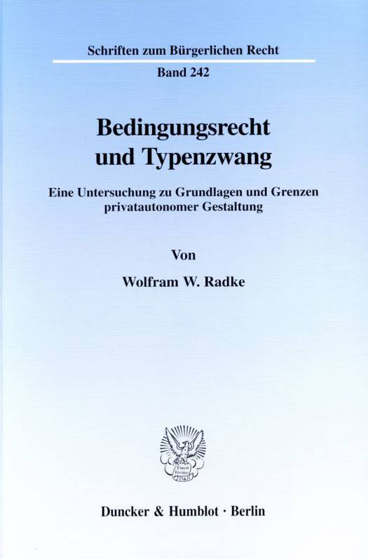 Der Autor nutzt die gewonnenen Erkenntnisse zum Institut des Typenzwangs für die Entwicklung einer allgemeinen Bedingungslehre. Während die herkömmlichen Erklärungsansätze die Bedingung als Einschränkung der Rechtsfolgen eines (gedachten) unbedingten Grundgeschäfts verstehen, entwickelt Wolfram W. Radke ein eigenständiges Erklärungsmodell, das von der Perspektive der Vornahme des bedingten Geschäfts selbst ausgeht. Schließlich werden die gefundenen Ergebnisse anhand von praktisch bedeutsamen Einzelfragen überprüft.