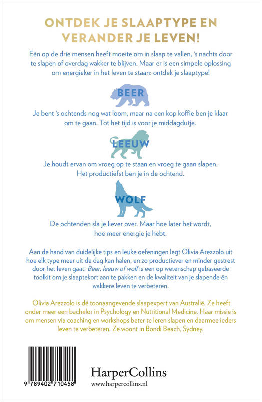 Aan de hand van duidelijke tips en leuke oefeningen legt Olivia Arezzolo uit hoe je meer uit je dag kunt halen, zodat je productiever en minder gestrest bent. Beer, leeuw of wolf is een op de wetenschap gebaseerde toolkit om je slaaptekort aan te pakken en de kwaliteit van je slapende én wakkere leven te verbeteren.