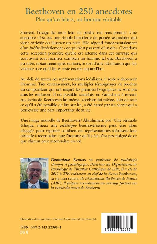 Une anecdote n'est pas une simple historiette de portée secondaire qui vient enrichir ou illustrer un récit. Elle répond fondamentalement d'un inédit, littéralement ce qui n'est pas sorti d'un dit . Que peut-on savoir d'un homme qui est né il y a 250 ans ? Au travers de ces anecdotes, l'ouvrage veut avant tout montrer combien un homme tel que Beethoven a pu subir, notamment après sa mort, le sort d'une idéalisation qui fait violence à ce qu'il fut et reste encore aujourd'hui. Une esthétique beethovénienne peut être alors dégagée pour rappeler combien ces représentations idéalisées font obstacle à reconnaître que l'homme qu'il a été n'est pas éloigné de ce que chacun peut reconnaître en soi.