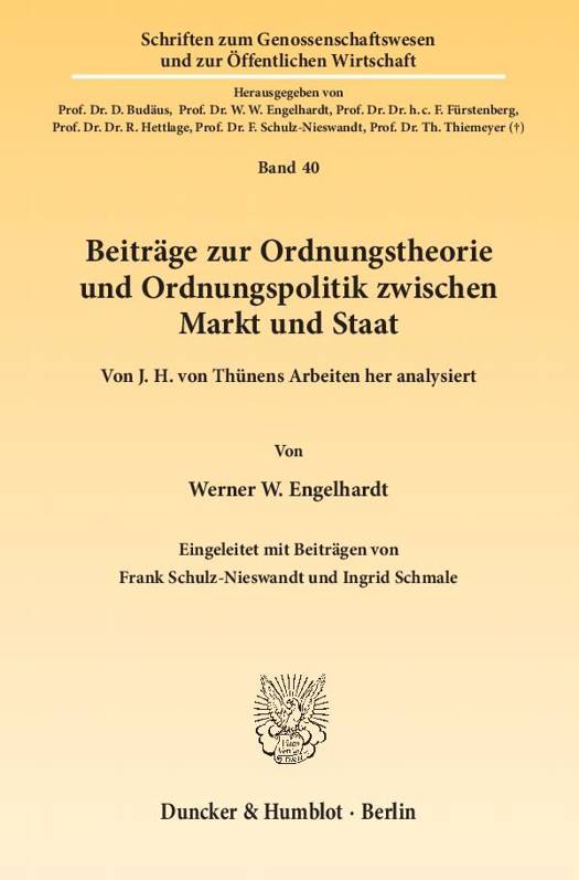 Prof. Dr. em. Werner Wilhelm Engelhardt (* 1926), Wirtschafts- und Sozialwissenschaftliche Fakultät der Universität zu Köln, hat hier eine gezielte und strukturierte Auswahl seiner wichtigsten Beiträge zusammengestellt. Sein Werk, das seit über 60 Schaffensjahren angewachsen ist, ist überaus komplex: vielschichtig und multi-dimensional, aspekten-reich, meta- wie objekttheoretisch, dogmengeschichtlich wie aktualitätsbezogen angelegt. Die Auswahl, ergänzt durch werksystematische Einführungen von Frank Schulz-Nieswandt und Ingrid Schmale, ermöglicht einen erleichterten Zugang zu dieser Komplexität. Immer fokussiert auf das Studium des Klassikers Johann Heinrich von Thünen (1783-1850) als erkenntnisleitende »Brille« (aber auch als unmittelbare Widmung an dessen Denken) wird das Spannungsfeld eines »Dritten Weges« entfaltet. Einerseits begründet in einem problematischen ordnungspolitischen Bi-Polarismus von Markt (bzw. »reinem«, kulturell »entbettetem« Kapitalismus) versus Staat (bzw. autoritärem »etatistischem« Sozialismus), andererseits genau diese ordnungstheoretische Binärik überwindend, kann Werner Wilhelm Engelhardt in seinen Beiträgen ein anderes Denken, eine andere Sichtweise der Ordnung der sozialen und wirtschaftlichen Wirklichkeit entfalten. Öffentliche Wirtschaft, Gemeinwirtschaft, Genossenschaften und Formen des »Dritten Sektors« erhalten so ihren Stellenwert im Formenpluralismus einer sozialen Marktwirtschaft in der Tradition des »freiheitlichen Sozialismus« der Kölner Schule von Gerhard Weisser. Auch die Sozialpolitik, Teil einer gestaltenden Gesellschaftspolitik, findet nun ihren Platz. Damit führt die Sichtweise weg von einer oeconomica pura und deckt, anthropologisch tiefgründig, auch die letzten ethischen und pädagogischen Fragen seines Werkes auf.