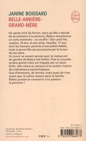 Un après-midi de février, alors qu’elle a décidé de se remettre à la peinture, Babou réceptionne un colis inattendu : un couffin ! Son petit-fils, Justino, 18 ans et son amie, Haydée, 17 ans, sont les heureux parents d’une petite Adella, mais la jeune fille est poursuivie par la fureur de son père. Un souci ne venant jamais seul, le restaurant du gendre de Babou est en faillite. Et puis, la nouvelle arrière-grand-mère va bientôt être frappée par un deuil. Enfin, elle volera au secours d’un enfant victime de maltraitance psychologique. Que d'émotions, de larmes, mais aussi de rires avant que, le calme revenu dans la famille, Babou puisse se consacrer à sa passion : la peinture !