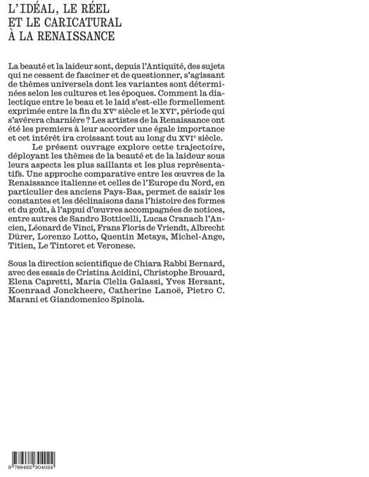 Ce catalogue de l'exposition "Bellezza e Brutezza : L'idéal, le réel et le caricatural à la Renaissance" explore cette trajectoire de façon inédite, à l'appui d'une approche rigoureuse et didactique, à travers une sélection d'oeuvres d'une qualité exceptionnelle et faisant l'objet de notices, visant à présenter les thèmes de la beauté et de la laideur dans leurs aspects les plus frappants et les plus représentatifs, en l'enrichissant d'une approche comparative entre les oeuvres de la Renaissance italienne et celles de l'Europe du Nord, en particulier des Pays-Bas, afin de mieux saisir les constantes et les variantes dans le goût et le style. Avec, parmi tant d'autres, les oeuvres de Botticelli, Véronèse, Dosso Dossi, Titien, Le Tintoret, Lucas Cranach l'Ancien, Bellini, Hans Baldung Grien, Quentin Metsys, Lorenzo Lotto, etc.