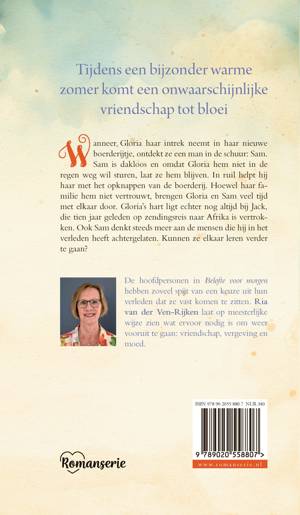 In ‘Belofte voor morgen’ van Ria van der Ven-Rijken heeft Gloria een boerderijtje op het Land van Heusden en Altena gekocht, waar ze plots ontdekt dat er een man in haar schuur verblijft: Sam. Sam is dakloos en omdat Gloria hem niet in de regen weg wil sturen, laat ze hem blijven. In ruil helpt hij haar met het opknappen van de boerderij. Ondanks dat haar familie hem niet vertrouwt, brengen Gloria en Sam veel tijd met elkaar door. Gloria’s hart ligt echter nog altijd bij Jack, die tien jaar geleden op zendingsreis naar Afrika is vertrokken. Ook Sam denk steeds meer aan de mensen die hij in het verleden heeft achtergelaten. Wat zal morgen hen brengen?