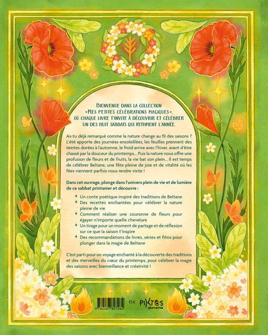 Bienvenue dans la collection « Mes petites célébrations magiques », où chaque livre t’invite à découvrir et célébrer un des huit sabbats qui rythment l’année. As-tu déjà remarqué comme la nature change au fil des saisons ? L’été apporte des journées ensoleillées, les feuilles prennent des teintes dorées à l’automne, le froid arrive avec l’hiver, avant d’être chassé par la douceur du printemps… Puis la nature nous offre une profusion de fleurs et de fruits, la vie bat son plein… Il est temps de célébrer Beltane, une fête pleine de joie et de vitalité où les fées viennent parfois nous rendre visite ! Dans cet ouvrage, plonge dans l’univers plein de lumière de ce sabbat printanier et découvre un conte poétique ; des recettes enchantées pour célébrer la nature ; comment réaliser une couronne de fleurs pour égayer n’importe quelle chevelure ; un tirage pour un moment de partage et de réflexion sur ce que la saison t’inspire ; des recommandations de livres, séries et films pour plonger dans la magie de Beltane. C’est parti pour un voyage enchanté à la découverte des traditions et des merveilles du cœur du printemps, pour célébrer la magie des saisons avec bienveillance et créativité !