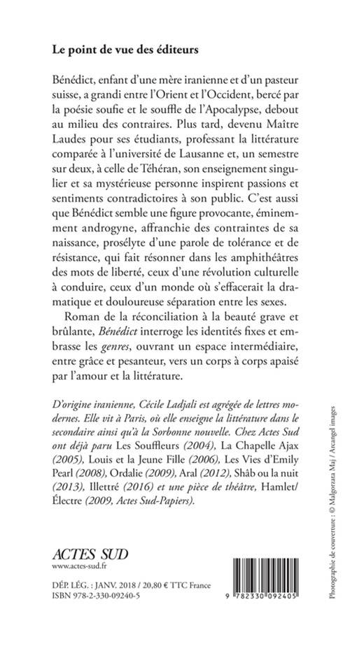 Bénédict, enfant d'une mère iranienne et d'un pasteur suisse, a grandi entre l'Orient et l'Occident, bercé par la poésie soufie et le souffle de l'Apocalypse, debout au milieu des contraires. Plus tard, devenu Maître Laudes pour ses étudiants, professant la littérature comparée à l'université de Lausanne et, un semestre sur deux, à celle de Téhéran, son enseignement singulier et sa mystérieuse personne inspirent passions et sentiments contradictoires à son public. C'est aussi que Bénédict semble une figure provocante, éminemment androgyne, affranchie des contraintes de sa naissance, prosélyte d'une parole de tolérance et de résistance, qui fait résonner dans les amphithéâtres des mots de liberté, ceux d'une révolution culturelle à conduire, ceux d'un monde où s'effacerait la dramatique et douloureuse séparation entre les sexes.