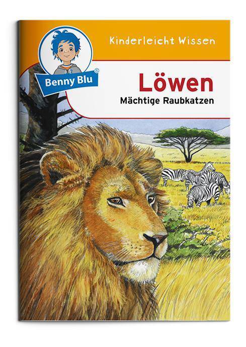 Schlafen und jagen. Benny Blu nimmt dich mit in die Welt der Löwen. Wo leben sie? Wie ziehen sie ihre Jungen groß? Wie jagen sie? Und warum haben Löwenmännchen eine Mähne? Benny Blu Lernbuch, Format DIN A6, 32 Seiten, geheftet, 4/4 farbig