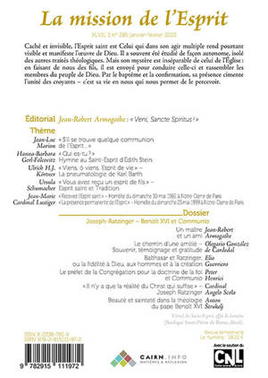 Caché et invisible, l'Esprit saint est Celui qui dans son agir multiple rend pourtant visible et manifeste l'oeuvre de Dieu. Il a souvent été étudié de façon autonome,isolé des autres traités théologiques.Mais son mystère est inséparable de celui de l'Eglise: en faisant de nous des fils, il est envoyé pour conduire celle-çi et rassembler les membres du peuple de Dieu. Par le baptême et la confirmation , sa présence cimente l'unité des croyants- c'est sa vie en nous qui permet de le percevoir.