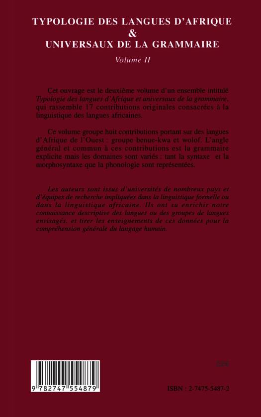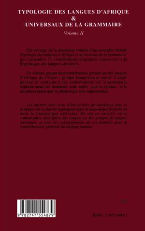 Cet ouvrage est le deuxième volume d'un ensemble intitulé "Typologie des langues d'Afrique et universaux de la grammaire" qui rassemble 17 contributions originales consacrées à la linguistique des langues africaines. Ce volume groupe huit contributions portant sur des langues d'Afrique de l'Ouest : groupe benue-kwa et wolof. Comme dans le volume précédent, l'angle d'approche général est la grammaire explicite et les domaines sont variés (syntaxe , morphosyntaxe et phonologie).