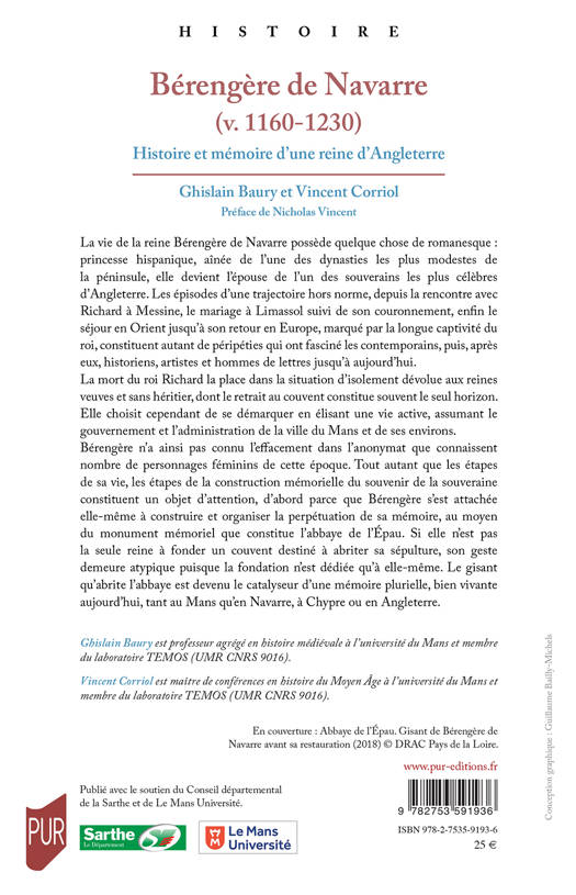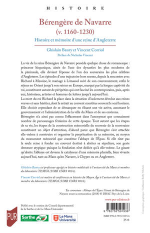 La vie de la reine Bérengère de Navarre possède quelque chose de romanesque : princesse hispanique, aînée de l'une des dynasties les plus modestes de la péninsule, elle devient l'épouse de l'un des souverains les plus célèbres d'Angleterre. Les épisodes d'une trajectoire hors norme, depuis la rencontre avec Richard à Messine, le mariage à Limassol suivi de son couronnement, enfin le séjour en Orient jusqu'à son retour en Europe, marqué par la longue captivité du roi, constituent autant de péripéties qui ont fasciné les contemporains, puis, après eux, historiens, artistes et hommes de lettres jusqu'à aujourd'hui.