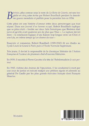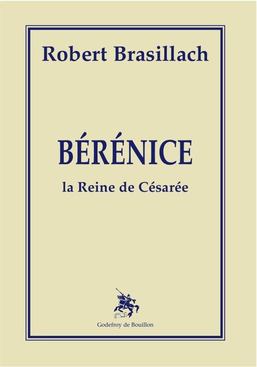 Bérénice, plus connue sous le nom de La Reine de Césarée, est une tragédie en cinq actes écrite par Robert Brasillach pendant la deuxième guerre mondiale et publiée pour la première fois en 1954. Cette pièce est une histoire d’amour entre deux personnages que tout sépare. Dans son Journal d’un homme occupé, Robert Brasillach explique que sa pièce était « fondée sur deux faits historiques que Bérénice était juive et qu’elle avait quatorze ans de plus que Titus ». La rupture devint donc « la conclusion logique d’une liaison trop longue entre un Chéri et une Léa, en même temps qu’un drame de race » Essayiste et romancier, Robert Brasillach (1909-1945) fit ses études au Lycée Louis-le-Grand à Paris puis à l’Ecole Normale Supérieure. Très jeune, il devint le responsable de la chronique littéraire de l’Action française et l’auteur de plusieurs chef-d’œuvres littéraires. En 1939, il succéda à Pierre Gaxotte à la tête de l’hebdomadaire Je suis partout. En 1945, victime des drames de l’épuration, il fut condamné à mort par une cour de justice et exécuté malgré une pétition signée et adressée au général De Gaulle par les plus grands écrivains français dont François Mauriac.