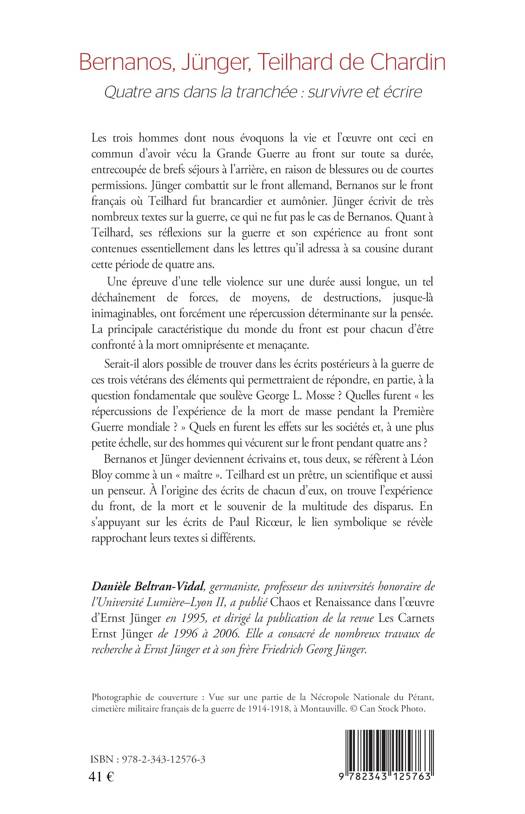 Bernanos, Jünger et Teilhard de Chardin ont ceci en commun d'avoir vécu la Grande Guerre au front. Or, une épreuve d'une telle violence sur une durée aussi longue, a forcément une répercussion sur la pensée. Serait-il alors possible de trouver dans les écrits de ces trois vétérans des éléments qui permettraient de répondre à cette question de George L. Mosse : quelles furent « les répercussions de l'expérience de la mort de masse pendant la Première Guerre mondiale ? » Et quels en furent les effets sur ces hommes ayant vécu le front pendant quatre ans ?